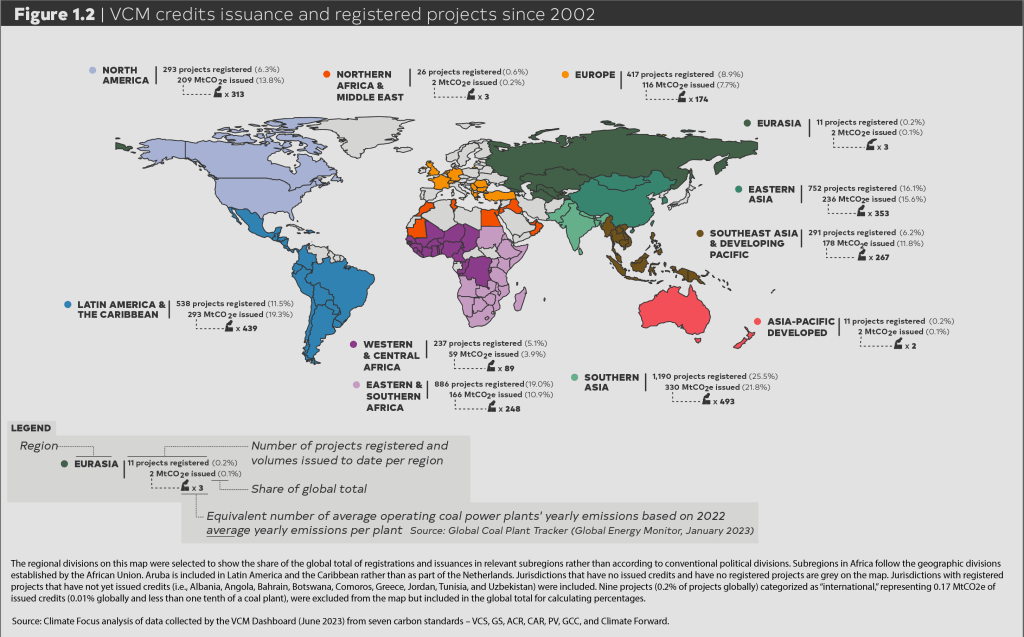 VCM issuances reached an all-time high in 2021 with 352 million credits issued. VCM volumes were lower in 2022, with 279 million credits issued, although 2022 was still the second largest year on record for the VCM. The slight decline in 2022 of the supply of VCM credits has been attributed to delays in issuances as carbon standards and auditors were overwhelmed with requests as well as to some governments pausing or halting VCM activities in their countries while they determine how they will apply Paris Agreement Article 6 rules. Concerns relating to the quality of carbon credits, the transparency of the market, and spurious carbon neutral claims have also made potential new market participants reluctant to engage in the VCM at a large scale. However, issuances remain high relative to historical levels and the overall volume of the VCM is expected to continue to grow. Globally, across all sectors, there are 4,661 VCM activities (projects and programs) that have generated 1,594 MtCO2e of GHG emission reductions and removals, which is equivalent to the average yearly emissions produced by about 2,384 coal plants (see Figure 1.2). Much of the supply of carbon credits comes from low- and middle-income countries.