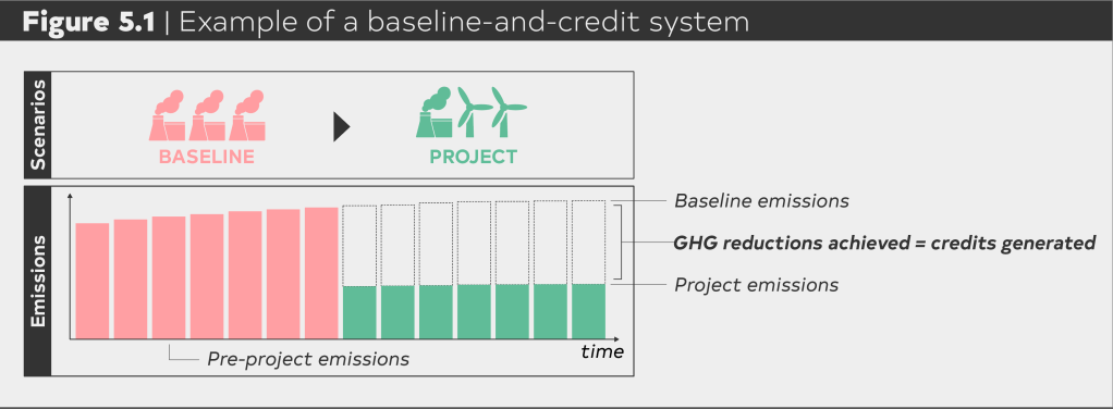 Carbon standards issue carbon credits using baseline-and-credit systems (see Box 5.1 below) that compare actual GHG emissions to baseline emissions. Baseline emissions are the GHGs that would have been emitted to or not removed from the atmosphere had the VCM activity not been implemented. Baselines are expressed in tCO2e per year for a period of a number of years – the crediting period. GHG emissions, reductions, and removals in a defined results period are compared against the GHG emissions in the crediting period. This comparison accounts for the differences between actual GHG emissions, reductions, or removals and the counterfactual emissions that would have occurred in absence of the VCM activity.